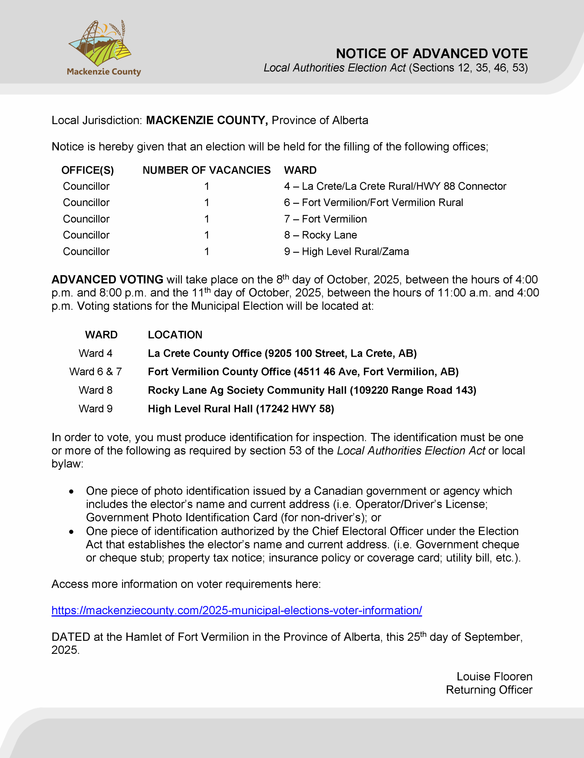 News | August 25, 2025 Bylaw 1379-25 Pursuant to the Municipal Government Act, being Chapter M-26 of the Statutes of Alberta, notice is hereby given that the Council of Mackenzie County will hold a public hearing prior to the [...]